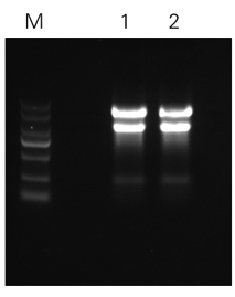 注解: 樣品:寄生曲霉 使用液氮研磨后的50 mg樣品,100μl洗脫 M:DL2000(ZOMANBIO) 1,2:莊盟ZP431提取結(jié)果 |