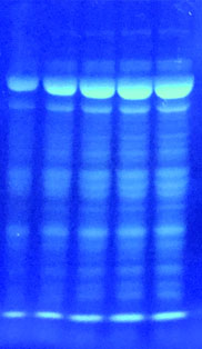 注解↑ 免染膠直接觀察, 從左至右為2倍梯度加樣全蛋白 |