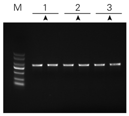 注解:三個月穩(wěn)定性實(shí)驗(yàn)結(jié)果圖 柑橘內(nèi)參基因GAPDH 1kb擴(kuò)增結(jié)果 RNA使用量為50 ng 1:4℃保存 2:37℃保存 3:-20℃保存 M:莊盟DL2000(3μl點(diǎn)樣) |