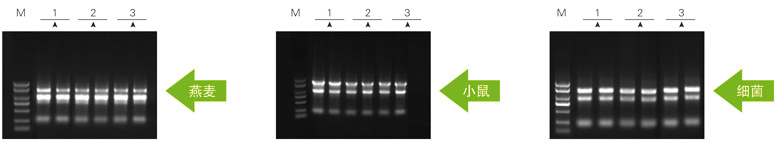 以上參考圖分別取50mg燕麥葉片,20mg小鼠肝臟和1ml細(xì)菌DH5α菌液各數(shù)份,組織進(jìn)行液氮研磨處理,菌液離心收集細(xì)胞后,分別加入1ml Zomanbio RNApure 和 T、I公司相應(yīng)產(chǎn)品,按各自說(shuō)明書進(jìn)行RNA提取。洗脫體積分別為80μl、100μl、60μl。RNA電泳上樣量分別為5μl,1%瓊脂糖凝膠電泳。