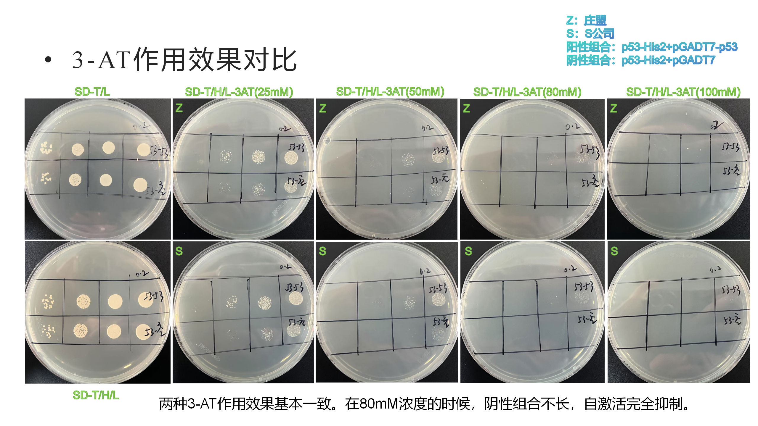 1.理想情況10 mM濃度的3-AT平板會有少量生長,20 mM濃度的3-AT不能或極少生長。如果在80 mM濃度的3-AT平板上生長酵母,說明自激活活性太高,不能用于雙雜交篩選。